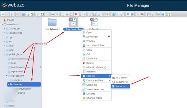 3. Browse functions.php file by following the path public_html>>wp-content >> themes.
