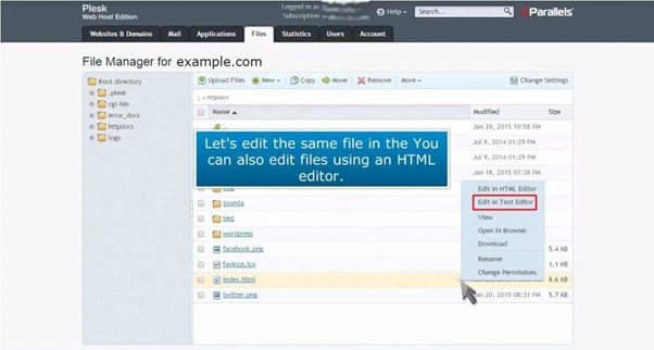 You can also edit pages of your website in File Manager. You get an HTML editor that allows visual editing of HTML pages (you don’t need to manually type HTML tags). For this process, place the mouse pointer over the file, click on the drop-down icon to open the file’s context menu, and select Edit in HTML Editor.