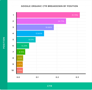 Good question. Studies have shown that 31.7% of users click on the first organic search result (position one); a whopping 75.1% of all clicks go to the top three search results. After that, the number of clicks shrinks rapidly with every following position.